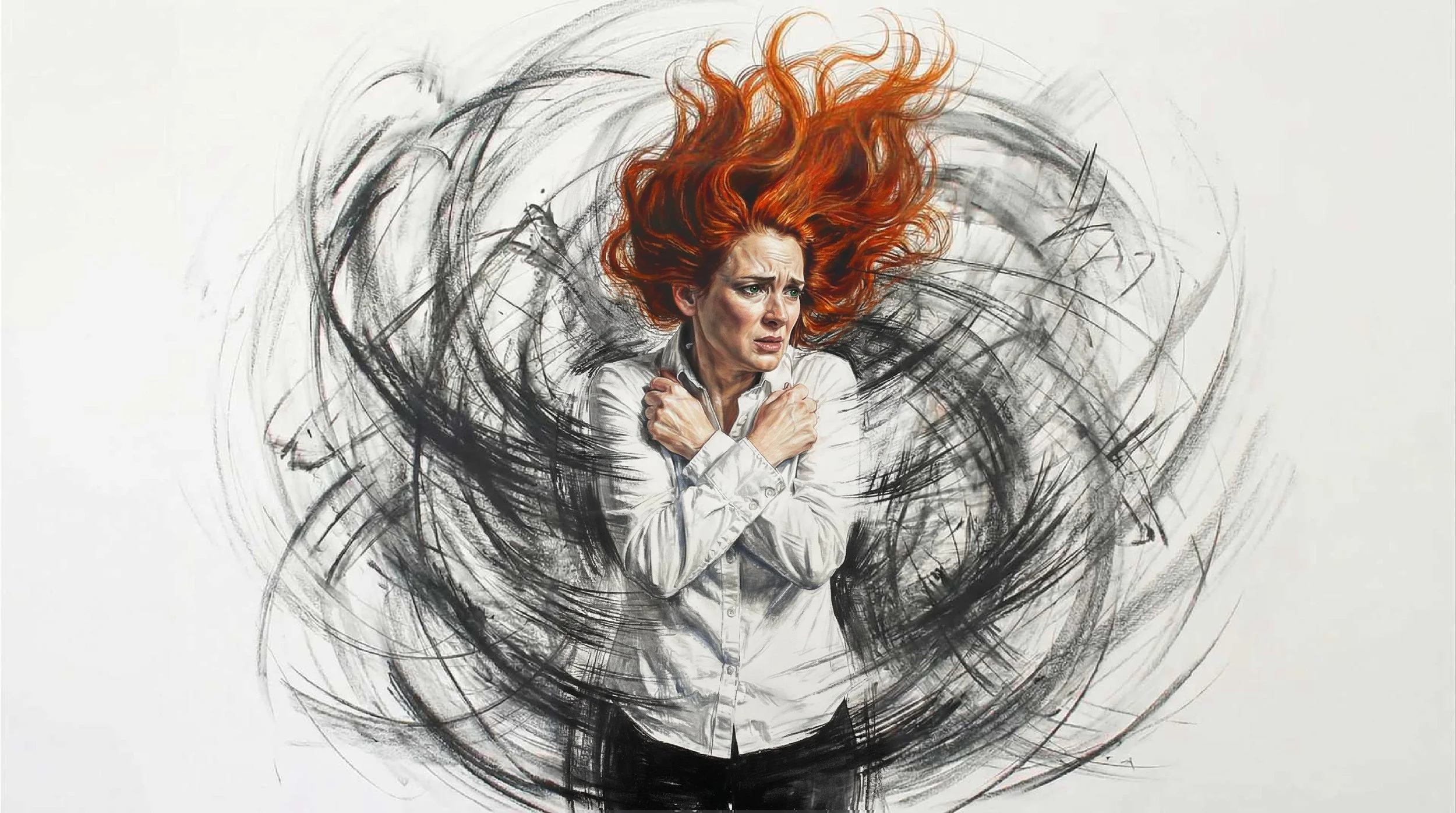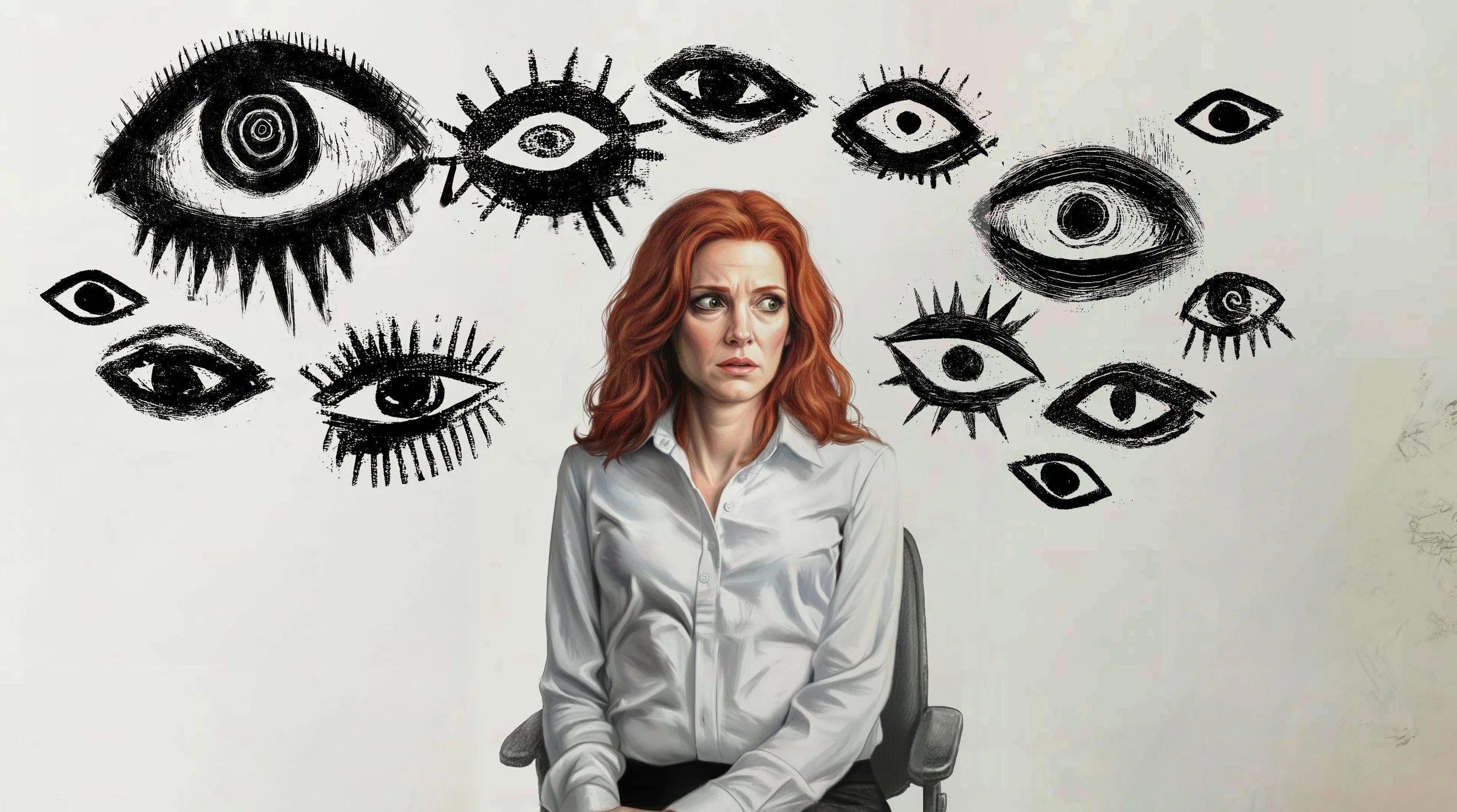 Inner turbulence is visualized as a chaotic tangle of spirals and tangled, unstable lines. Conflict situations can take on a jagged, rough, saw-blade-like character. Paranoid thoughts can be represented as scribbles that form into dark silhouetted figures, suggesting distorted or faulty pattern recognition. As Ava is able to parse her thoughts and achieve clarity, the lines gain colour, distinction and shape.